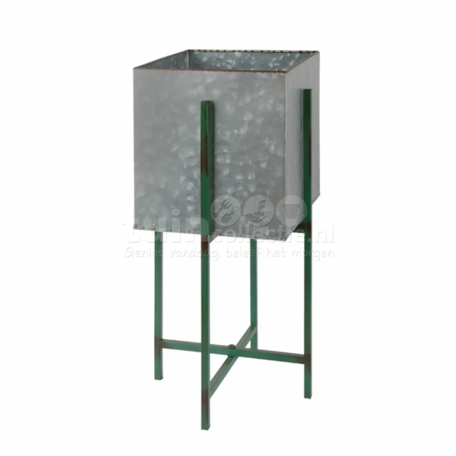 Creëer hoogte in huis of tuin met deze stoere bloempot op standaard! De Esschert Design bloempot is vierkant van vorm en gemaakt van zink. De standaard is gemaakt van metaal en is groen van kleur met bruine details. Deze combinatie zorgt voor een stoere en natuurlijke touch in jouw woonkamer of tuin. De vierkante bloempot heeft een afmeting van 21x21cm, inclusief standaard komt de breedte uit op 23cm. Daarnaast is hij in totaal ca. 47cm hoog, waarbij de pot een hoogte heeft van 24cm. Vul de zinken bloempot met een plant of bloem naar keuze, vouw de standaard uit en plaats de bloempot erin en geniet vervolgens volop van het groen! Wil je de bloempot binnenshuis plaatsen, maak dan gebruik van een plastic hoes of zak om lekken van water en potgrond te voorkomen. Plaats je de bloempot buiten, dan is een hoes niet nodig.