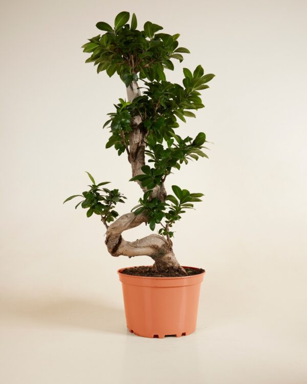 De Ficus Ginseng is een populaire kamerplant met een dikke, decoratieve wortelbasis en glanzend groene bladeren. Door zijn bonsai-achtige vorm zorgt hij voor een rustige en stijlvolle uitstraling in elk interieur.