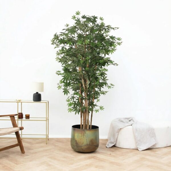 De Acer Palmatum vindt zijn oorsprong in Japan, Korea en China en staat bekend om zijn verfijnde bladeren en sierlijke, elegante groeiwijze. Verzorging&tips Kunst Acer Palmatum – 180cm De Kunst Acer Palmatum – 180cm is een stijlvolle kunstboom die direct zorgt voor een rustige en luxe uitstraling in huis. Door zijn hoogte is deze plant een echte blikvanger in bijvoorbeeld de woonkamer, hal of op kantoor. Omdat het een kunstplant is, heeft deze boom geen water, voeding of speciale verzorging nodig. Om de plant mooi te houden kun je af en toe het stof van de bladeren verwijderen met een droge of licht vochtige doek. Waterbehoefte Kunst Acer Palmatum – 180cm De Kunst Acer Palmatum – 180cm heeft geen water nodig. De bladeren blijven het hele jaar door mooi van kleur en vol zonder onderhoud. Af en toe afstoffen is voldoende om de natuurlijke uitstraling te behouden. Lichtbehoefte Kunst Acer Palmatum – 180cm Deze kunstboom kan op vrijwel iedere plek in huis staan. Zonlicht, halfschaduw of schaduw hebben geen invloed op de conditie van de boom. Wel is het aan te raden om de boom niet langdurig in fel direct zonlicht te plaatsen, zodat de kleuren van de bladeren langer mooi blijven. Is de Kunst Acer Palmatum – 180cm giftig? De Kunst Acer Palmatum – 180cm is niet giftig zoals sommige levende planten dat kunnen zijn. Toch adviseren we om de boom buiten bereik van kleine kinderen en huisdieren te plaatsen om beschadiging te voorkomen. Hoe wordt mijn Kunst Acer Palmatum – 180cm verzonden? Onze kunstplanten worden zorgvuldig verpakt en beschermd verzonden, zodat ze in goede conditie bij je thuis aankomen. Na ontvangst kun je de takken en bladeren eenvoudig in model buigen voor een volle en natuurlijke uitstraling.