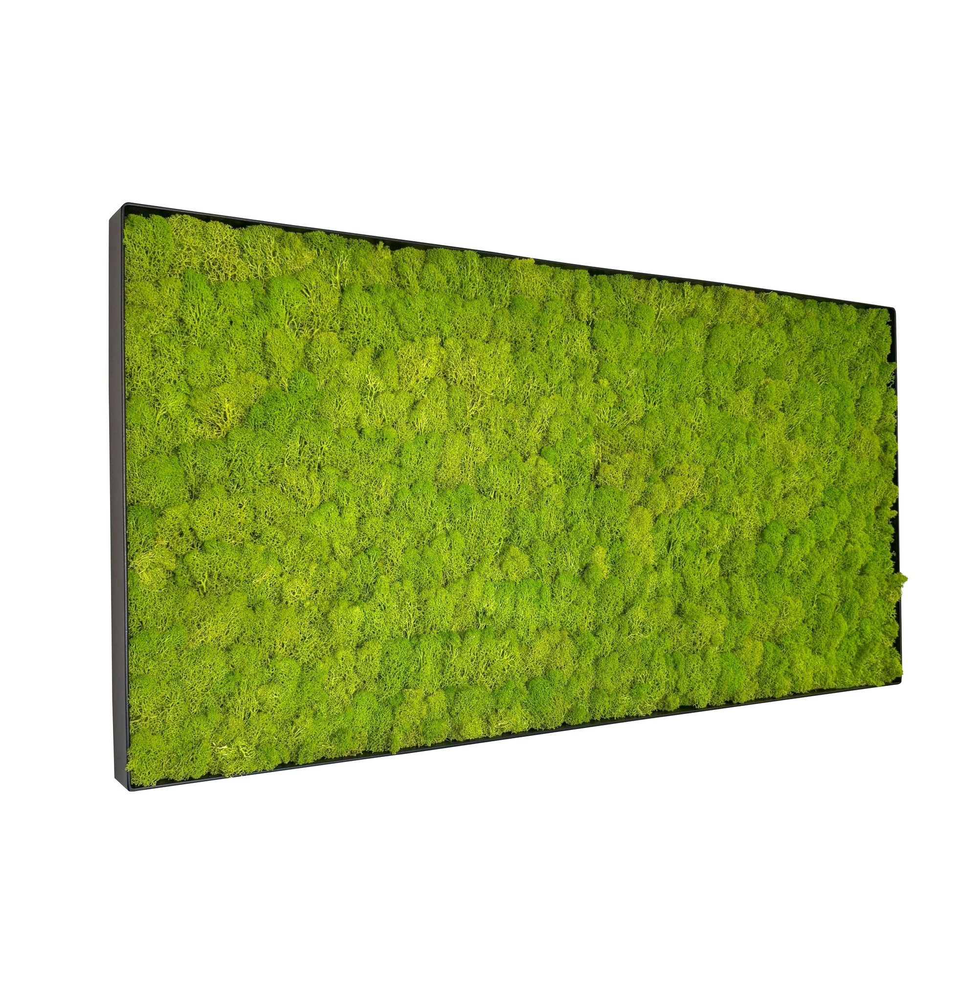 MOSS concepts Mosschilderij Linn Metal 100x50cm. is een prachtig rendiermos schilderij in de vrolijke kleur springgroen! Het mosschilderij heeft een prachtige metalen lijst met een luxe mat zwarte poedercoating!